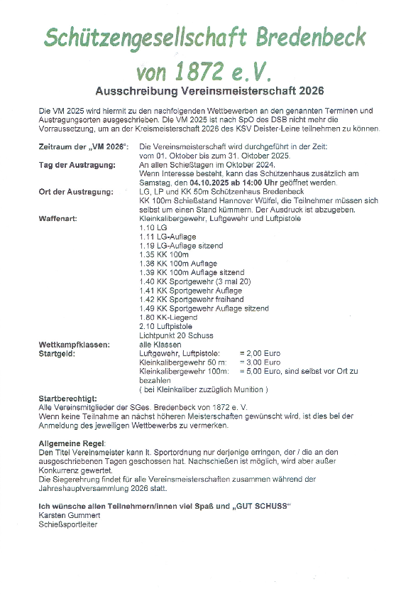 Aktuelle Ausschreibungen Hier findet ihr unsere aktuellen Ausschreibungen der teils öffentlichen Schießveranstaltungen. Vereinsmeisterschaft 2026 KK Freihand 2025 Wilde Sau 2025 Jugendpokal 2025 Lichtpunktpokal 2025